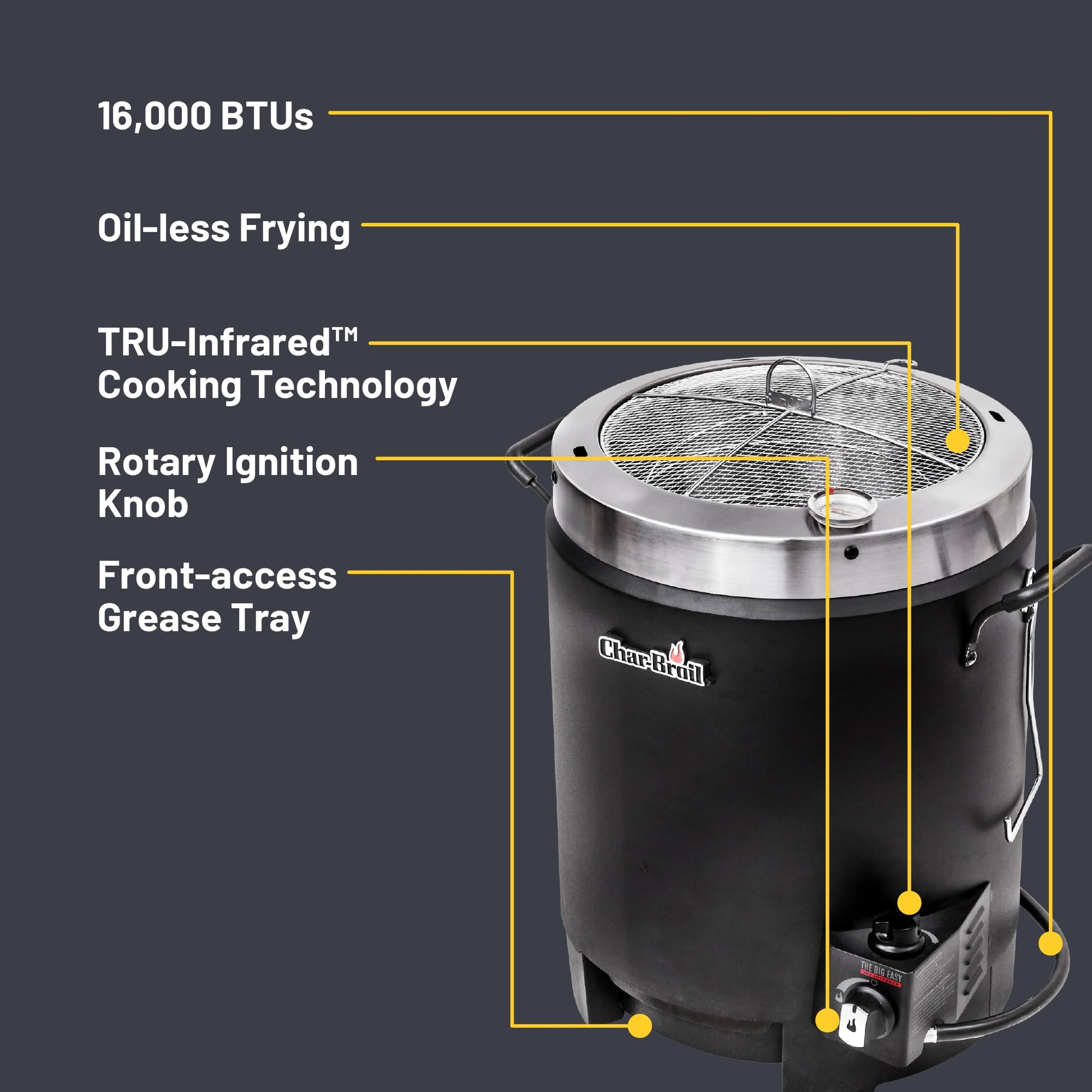 Get the fastest, easiest, and safest way to fry. The Big Easy® Oil-less Turkey Fryer is powered by TRU-Infrared™ cooking technology for juicy results inside and a crispy outside every time. With no need for oil, avoid the extra calories and stress of clean-up. Holding up to 16 pounds, cook your turkeys, roasts and chicken with ease. A rotary ignition provides a quick and easy light with the turn of a knob, and a front access grease tray makes cleaning quick.