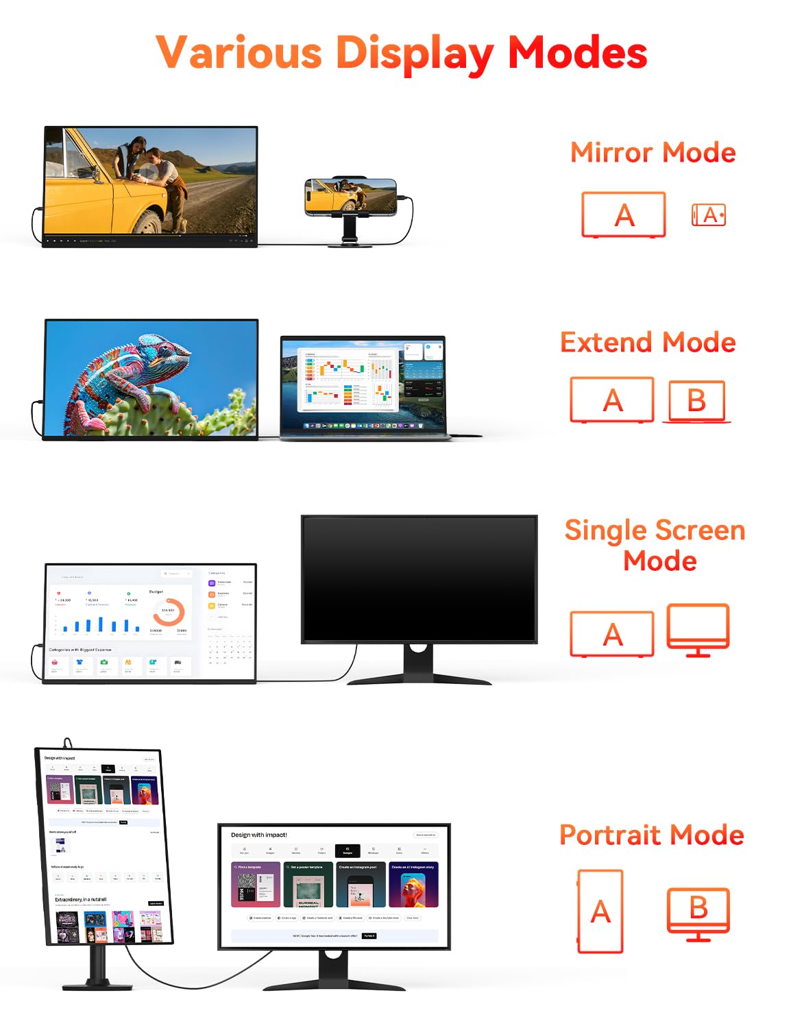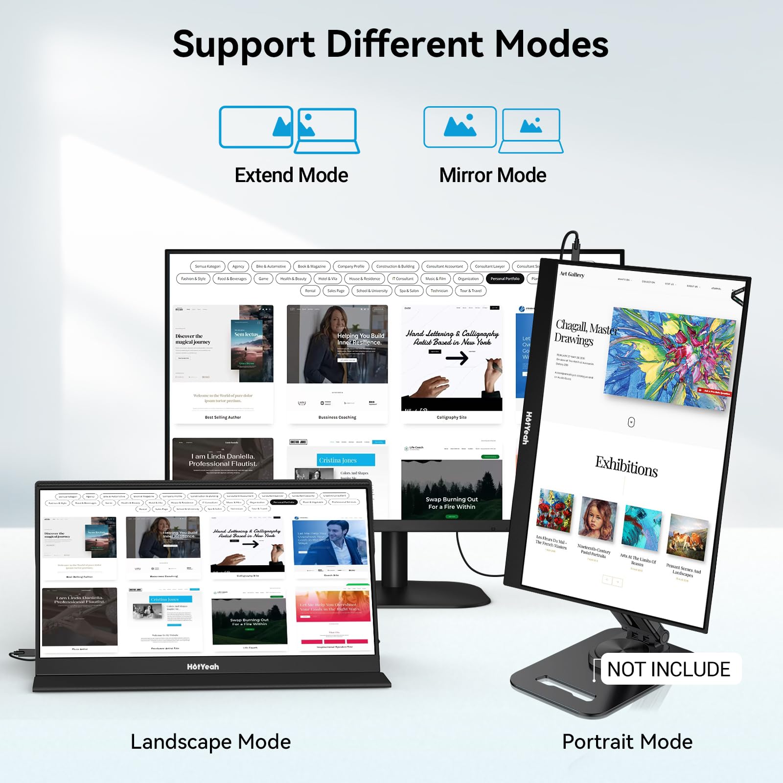 - Multiple Flexible Modes - HotYeah laptop monitor can be used as the main screen alone. Also, you can mirror your laptop screen with your colleagues in meetings or extend your laptop window tags for multi-tasks, increasing productivity by 300%. Mirror your phone screen to enjoy a clear movie or duplicate your Switch to gain a better gaming experience. Optional landscape and portrait modes can be adjusted to handle different work like editing photos, reading documents, and analyzing data.