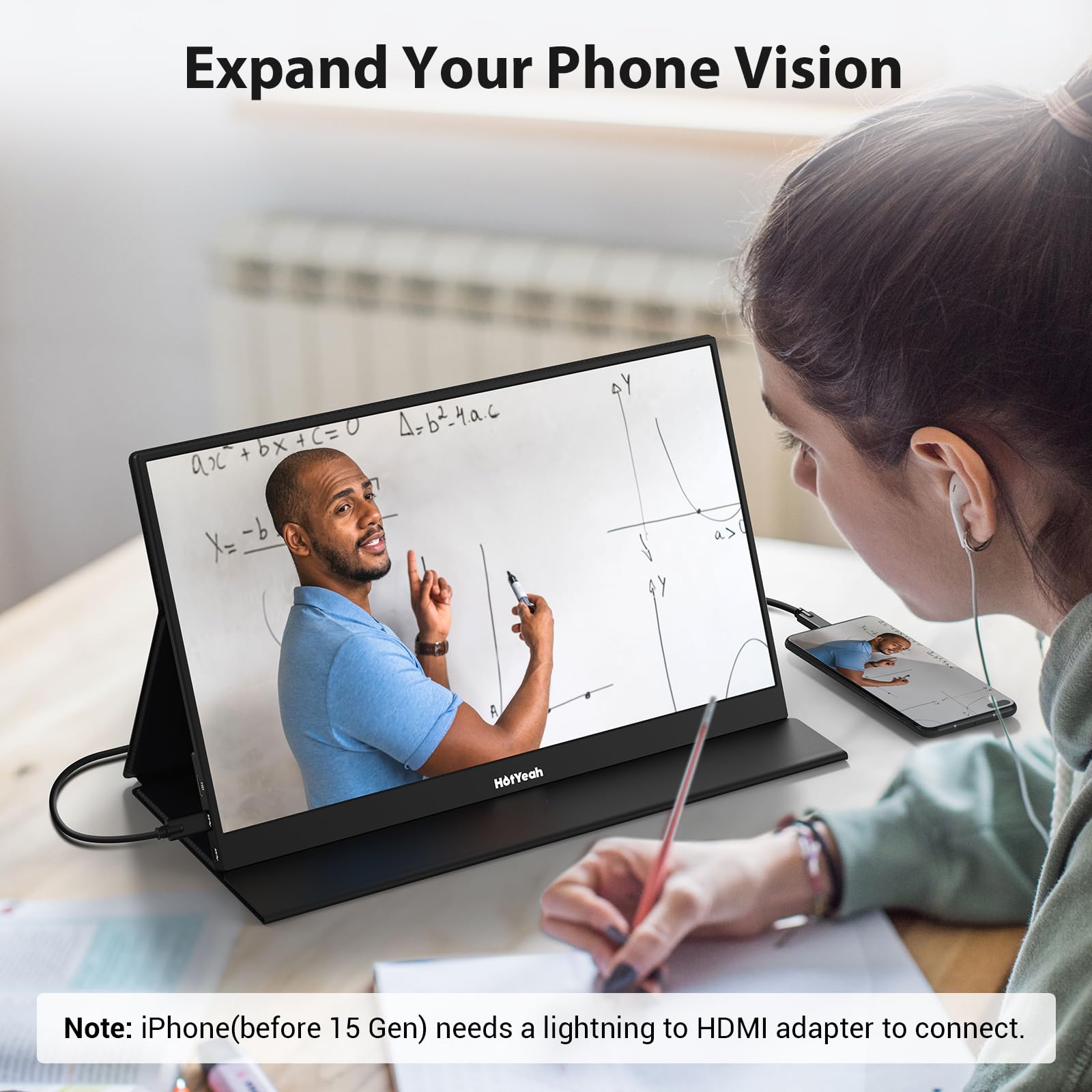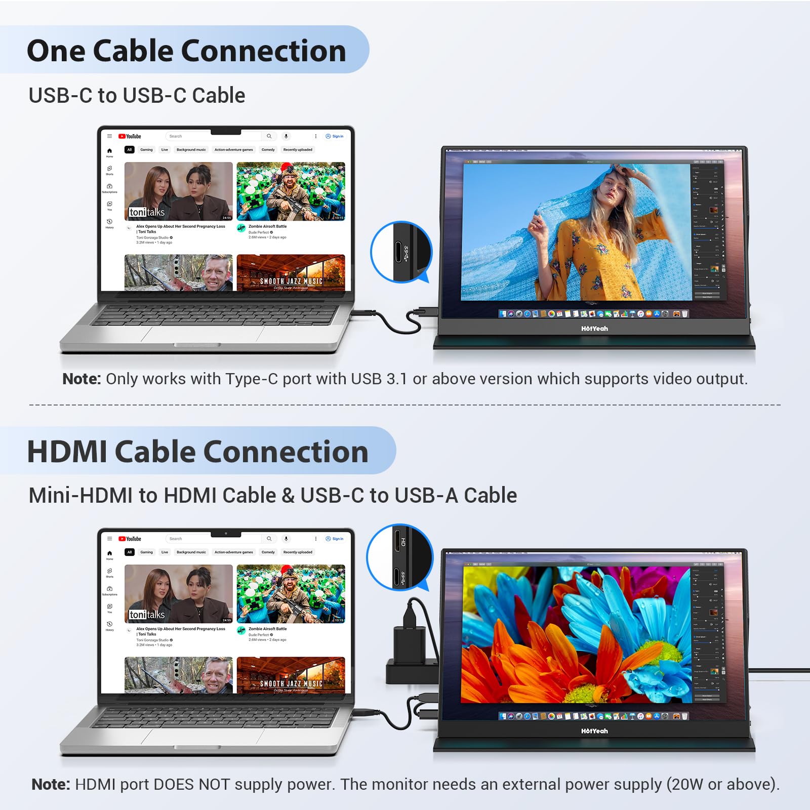 - USB-C HDMI Compatibility - Features with 2 full-function USB-C ports and 1 Mini-HDMI port, HotYeah external monitor works well with most laptops, PCs, phones, tablets, and game devices like Switch, PS5/4, XBOX, Wii, etc. Plug and play, no driver or app. Only one USB-C cable is needed for connection and say goodbye to redundant cables! Note: Your device should support Thunderbolt 3.0/4.0 or USB 3.1 Type-C DP ALT-MODE. The extra OTG port is designed for your keyboard or mouse.